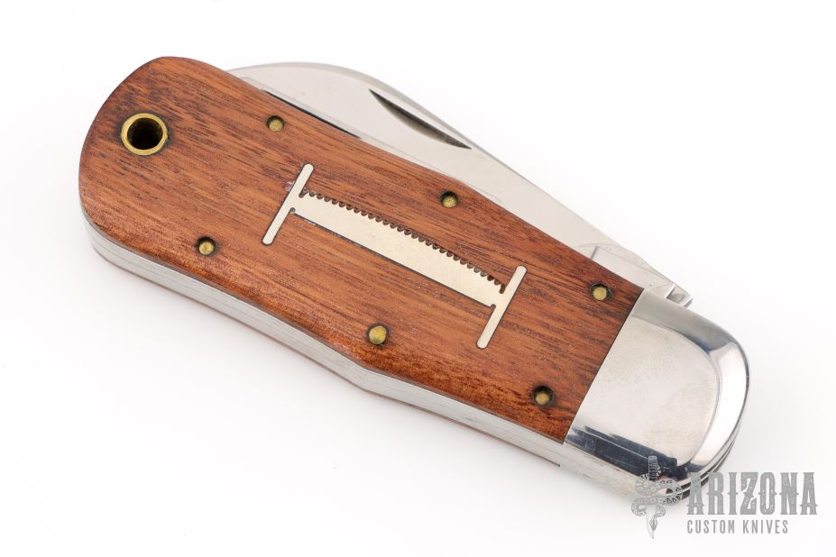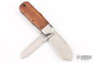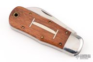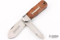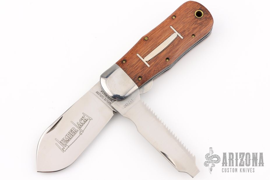 This Lumberjack Knife by Great Eastern Cutlery features 2 satin finished blades with nail nicks. The handle has stainless steel bolsters, wood covers, stainless steel liners and springs. Both blades have half-stops, saw blade is also a linerlock. Comes in original tube and paper. Has some light scratches, excellent condition otherwise.