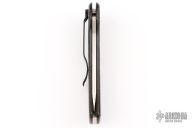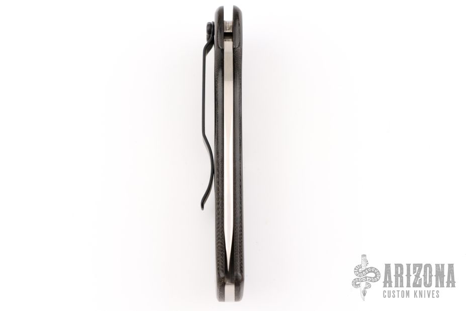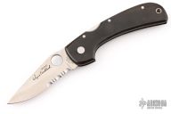 The C18PS Wayne Goddard Jr. folder was only produced for 6 years, and now is a very collectable knife. Black linen micarta handle and GIN-1 steel. Partially serrated blade with thumbhole. Has some scuffs, scratches, and patina. Great condition otherwise.
