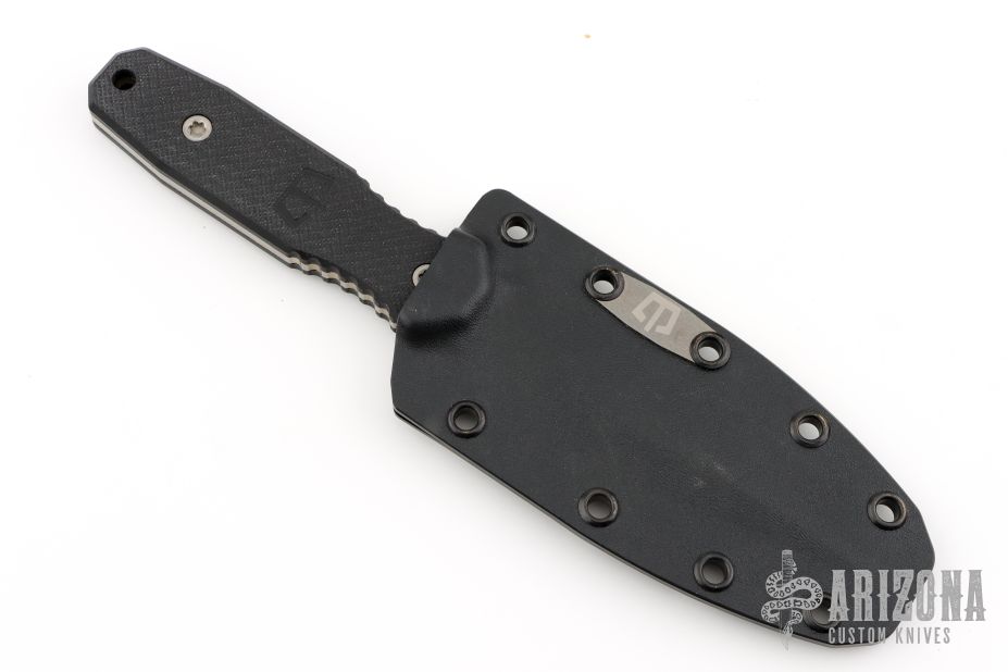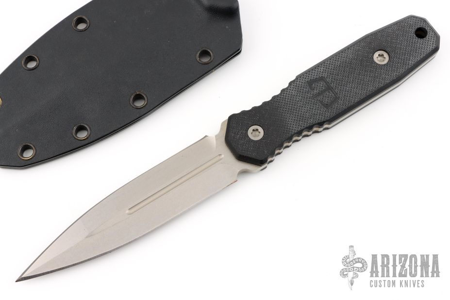 This Phase 7 SDM by Blackside Customs features an stonewash finished double-edged blade with fullers, .150" blade stock and 1.081" blade depth, full tang construction. The handle has black G-10 scales with blasted hardware. Comes with a kydex sheath with logo plate. Excellent condition.