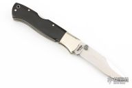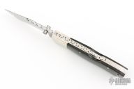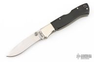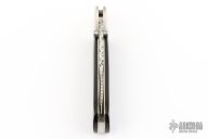 This Mamba Lockback from Blackjack Knives features a satin finished recurve blade with dual thumb studs. The handle has nickel silver bolsters, liners, paper micarta covers, with stainless rockerbar and lanyard hole in pommel. Blade spine, and spring have been file worked by Ken Metsala. Has some light scuffs and scratches, great condition otherwise.