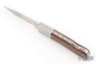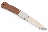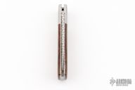 This lockback by Taiyo has been customized by Ken Metsala. It features a satin polished blade with nail nick. The handle features satin stainless bolsters and wood covers with stainless liners and stainless steel spring. Blade spine, liners, and rockerbar have been file worked. Has some light scuffs, excellent condition otherwise.