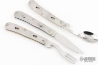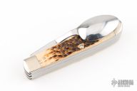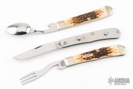 The traditional Hobo pocket knife from Case Knives is outfitted with jigged, amber bone covers and a Tru-Sharp stainless steel clip point knife, spoon, and fork with bottle opener. (6354HB SS) Has a few light scratches, otherwise excellent condition.