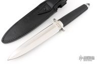 This Tai Pan from Cold Steel features a satin finished double-edged blade, .190" blade stock and 1.340" blade depth, hidden tang construction. The handle has a stainless steel guard and pommel, and rubber grip. Comes with original black leather sheath. Excellent condition. Made in Japan
