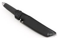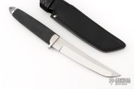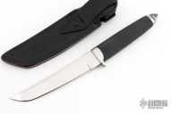 This Master Tanto by Cold Steel features a satin finished blade with .189" blade stock and 1.111" blade depth, hidden tang construction. The handle consists of a stainless steel guard and pommel with a textured rubber grip. Includes black leather sheath with belt loop. This knife has been refinished, removing the makers marks, the tip has been reprofiled, and the knife has been resharpened, otherwise good condition.