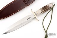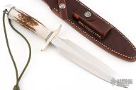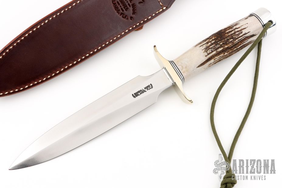 This Model 2-7 Dagger by Randall Made Knives features a double-edged satin finished blade with .206" stock and 1.264" blade depth, hidden tang construction. The handle has a nickel silver guard with black and duralumin spacers and a stag grip, duralumin butt with lanyard hole. Comes with a brown leather sheath. Excellent condition.
