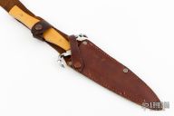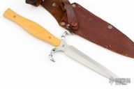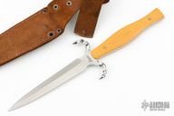 This dagger by Dane Dawson features a satin finished double edged blade with .135" blade stock and .680" blade depth, full tang construction. The handle has twisted and polished quillions, yellow paper micarta scales with brass pins. Has a couple small oxidation spots, otherwise excellent condition. Comes with a brown leather sheath.