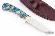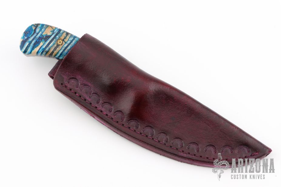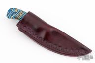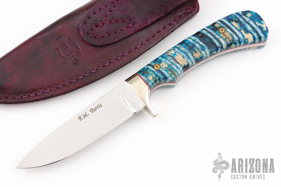 This drop point hunter by Phillip M Parris features a mirror polished blade with .147" blade stock and .984" blade depth, full tang construction. The handle has a nickel silver guard, mammoth tooth scales with mosaic pins and red liners. Comes with a leather sheath. Excellent condition.