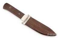 This Knife by Tim Britton has a satin finished blade with full tang, .105" blade stock and 1.064" depth. Handle has nickel silver bolsters, wood scales and nickel silver pins. Comes with matching wooden scabbard with engraved nickel silver collar. Has some light scratches, otherwise excellent condition.