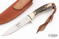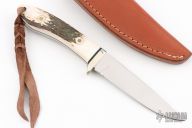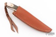 This knife by Junglee was designed by Tak Fukuta, it features a mirror polished blade with .126" blade stock and .868" blade depth, full tapered tang construction. The handle has a nickel silver guard and stag scales with black liners. Comes with a brown leather sheath. Excellent condition.