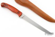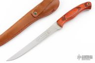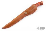 This Fillet knife by Wolf Borger features a satin finished blade, .110" blade stock and .750" blade depth, full tang construction. The handle has dymondwood scales with brass pins and a lanyard hole. Comes with a brown leather sheath. Has some scratches, otherwise good condition.