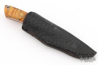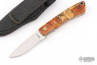 This knife by Bobby Toole features a hand rub satin finished blade with notched finger rest, .096" blade stock and .620" blade depth, full tang construction. The handle has spalted maple scales with mosaic pins and a lanyard hole. Comes with a black leather sheath. Has a few light scratches, otherwise excellent condition.