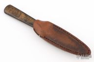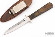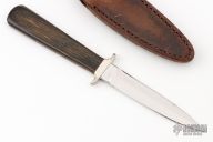 This Boot Dagger by Pat Crawford features a mirror finished double edged blade with .167" blade stock and .685" blade depth, hidden tang construction. The handle has a nickel silver guard and dymondwood grip with black and red spacers. Has a couple light scratches, otherwise excellent condition. Comes with brown leather boot sheath. #288 and "C.E.K." on the blade.