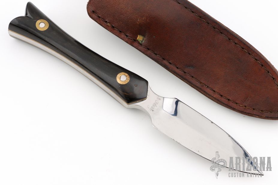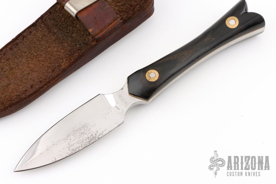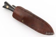 This Boot Dagger by Weldon Whitley features a mirror polished double edged blade with .182" blade stock and .955" blade depth, full tang construction. The handle has dymondwood scales with white liners/spacers. Includes a brown leather sheath with boot clip. Has a couple light scratches and oxidation, otherwise good user condition.