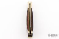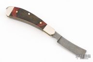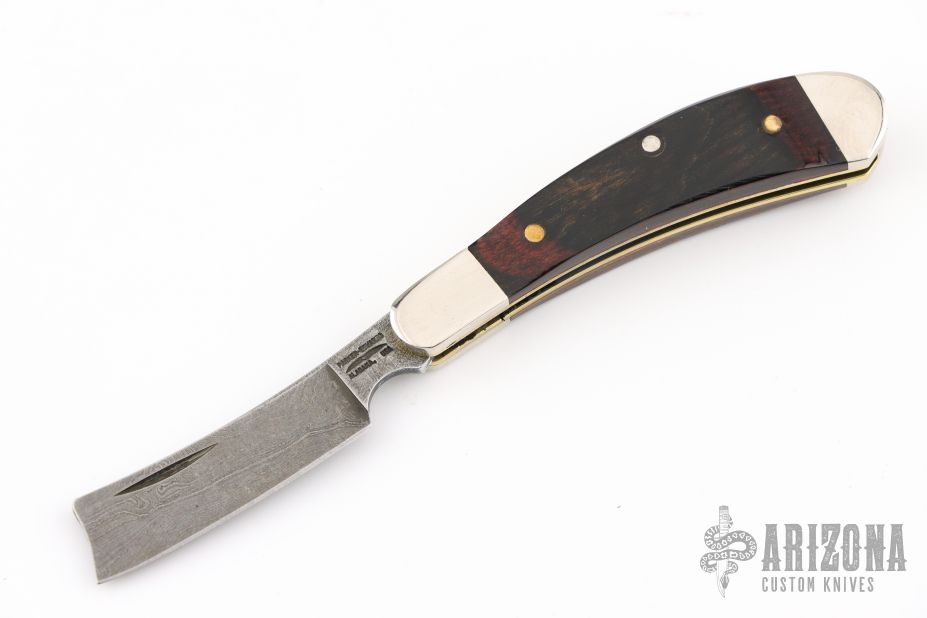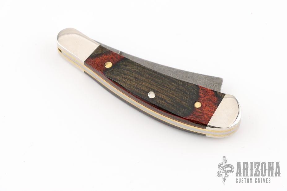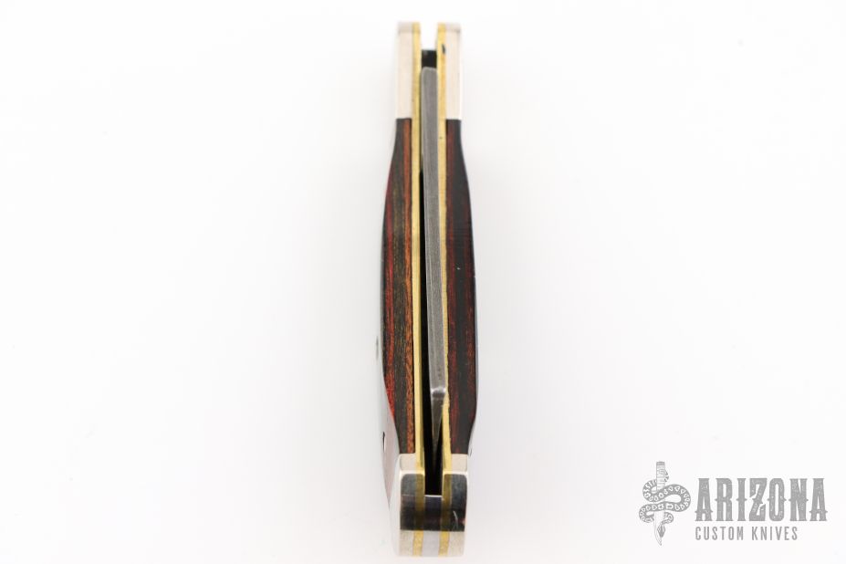 This slipjoint by Parker-Edwards feature a Damascus blade with nail nick. Nickel Silver front and rear bolsters with wood covers. Brass liners and stainless steel spring. Has some light scuffs and scratches, great condition otherwise.