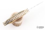 This slipjoint by Parker Cutlery Company features satin finished blades with nail nicks. The handle has nickel silver bolsters, bone covers, brass liners, steel springs. Has some light scratches, otherwise excellent condition. Blade spines, and springs have been file worked by Ken Metsala, as well as the covers replaced. Has some scuffs and scratches, great condition otherwise. Comes in original box and papers.