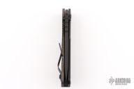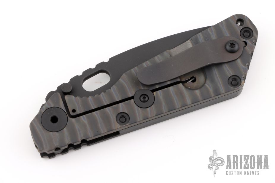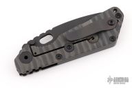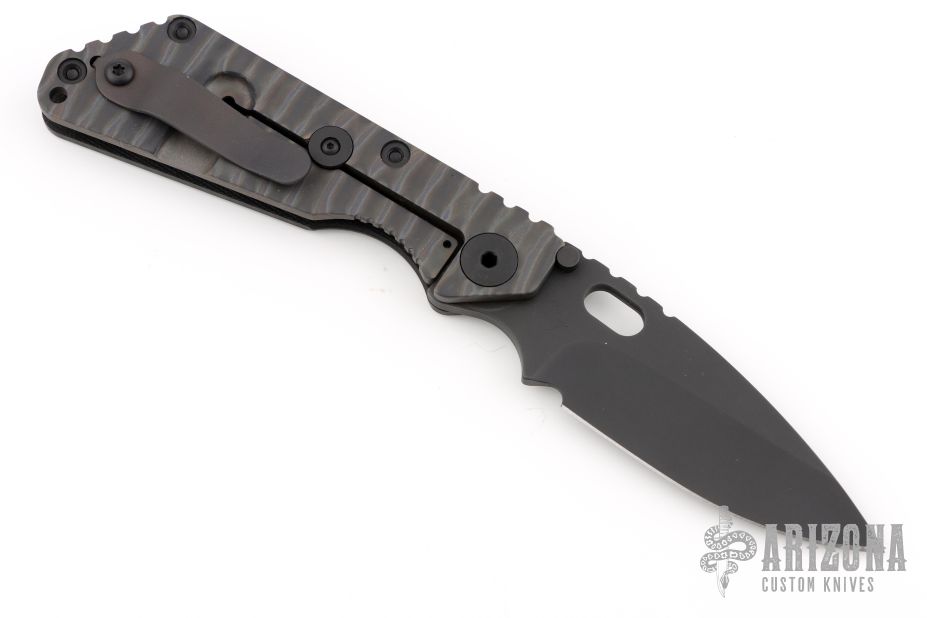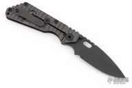 This Strider SNG framelock folder features a black blade with thumbhole and notched thumbrest. The handle has a black G-10 and flamed titanium frame with titanium clip, tip up carry. Jimping on blade spine. Nice lockup, detent, and blade seating. Excellent condition.