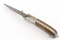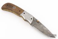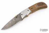 This linerlock folder features a Damascus blade with fileworked spine and dual thumbstuds. The handle has engraved steel bolsters, burlap micarta scales, brass liners with fileworked spines and a fileworked stainless steel backspacer. Nice detent, lockup and blade seating. Has some scuffs, scratches, and patina. Great condition otherwise.