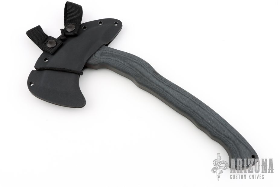 The WK RnD Axe Series is a collaborative design between Master Bladesmith Daniel Winkler and skilled Sayoc Kali martial arts trainer Rafael Kayanan. The full-size model is the most tested and highly developed axe produced by Winkler Knives, and has been proven in combat applications by a Special Operations Force Team. It is a favorite among operators and servicemen who choose their own equipment. The handle design provides a standard grip position, as well as a secondary close quarter grip that was developed to emulate the feel of a handgun grip. Axe Specifications Axe steel: 80CrV2 Black oxide no-glare finish Head length: 6" Overall length: 13 1/8" Blade thickness: 3/8" Skeletonized full tapered tang Optional Front Spike Sheath Fast draw carrier Lined Kydex® HD shockcord quick-release retention system Nylon belt straps with Mil-Spec Pull-The-Dot™ snaps Designed for multiple carry options (See our Info page for carry options) Comes with the original packaging. Excellent condition.