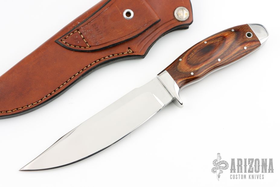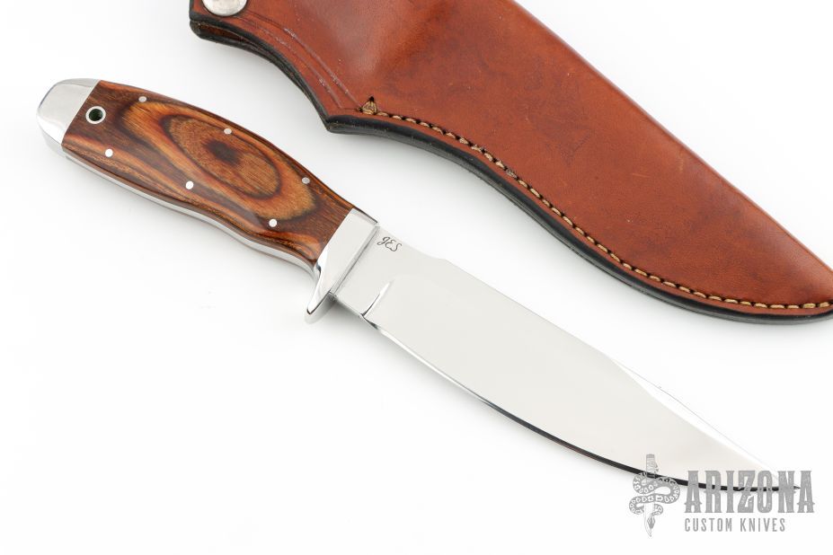 This Hunter by James Sponaugle features a mirror polished blade with .222" blade stock and 1.220" blade depth, full tapered tang construction. The handle is comprised of a stainless steel guard with wood covers, and lanyard hole in pommel. Includes a leather belt sheath. Knife and sheath are marked "Knife Baron" and "JES". Excellent condition.