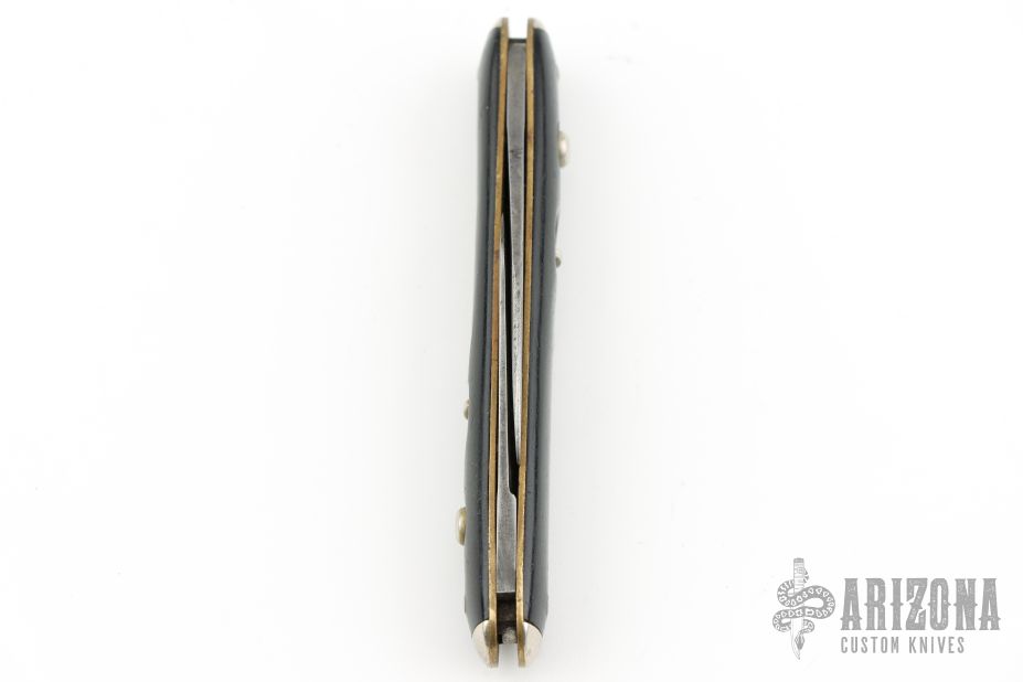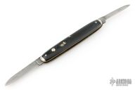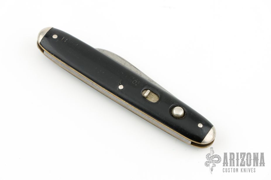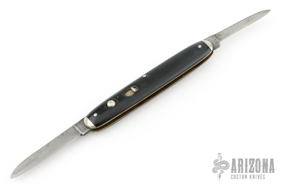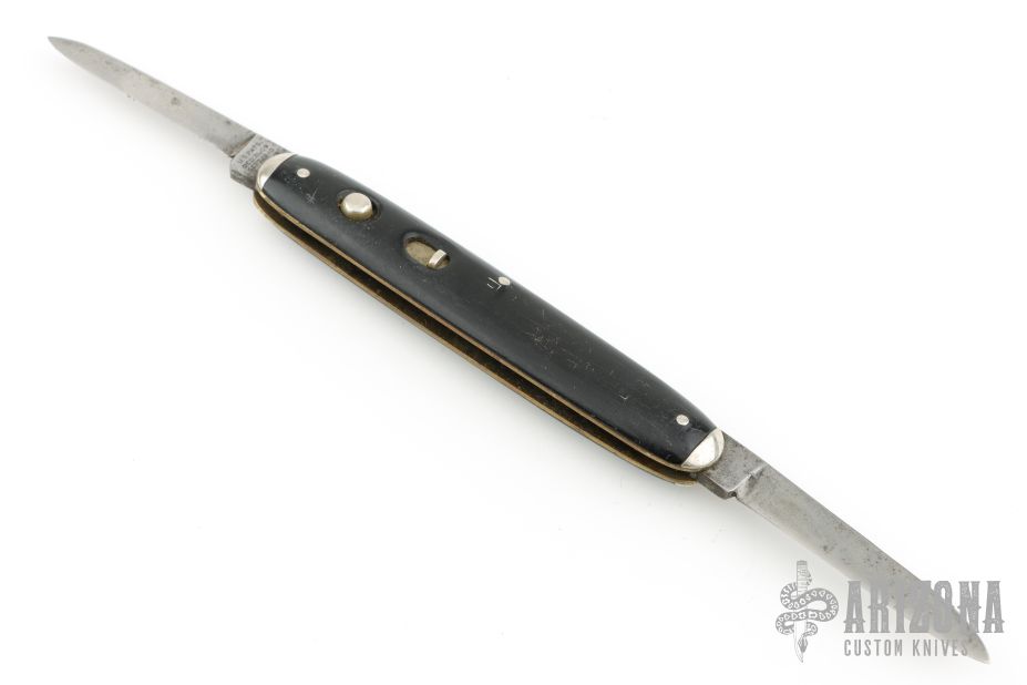 This double auto by Schrade was made between 1909-1916, it features two blades both with their own push button and safety. The handle has nickel silver bolsters, acrylic/celluloid scales, brass liners and steel backspacer. Has some light oxidation and scratches, otherwise good condition for its age. US Patents DEC 21,09, SEP 13, 10, JUNE 6, 16 on the ricasso. This knife is over 100 years old.