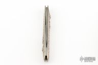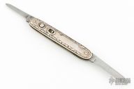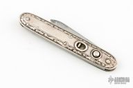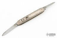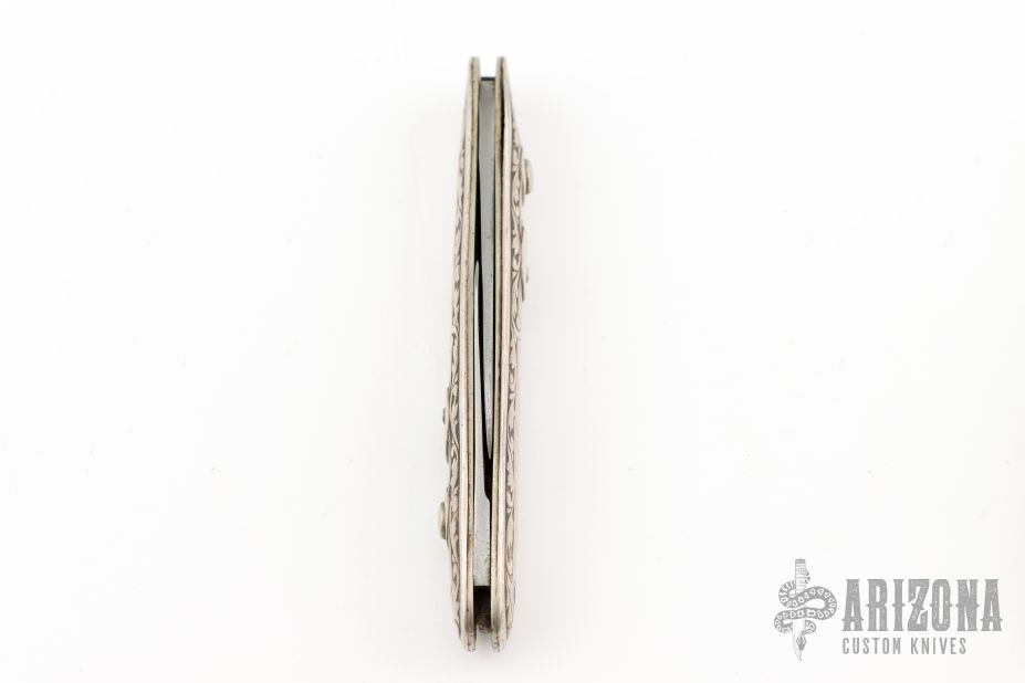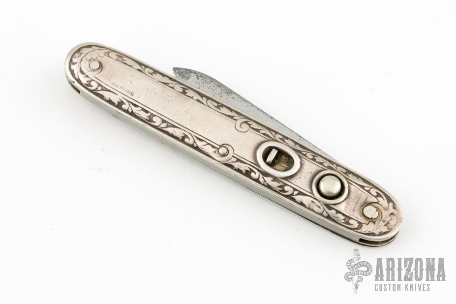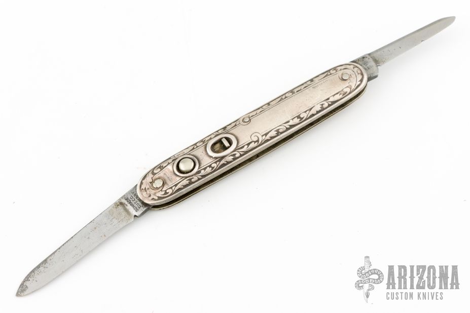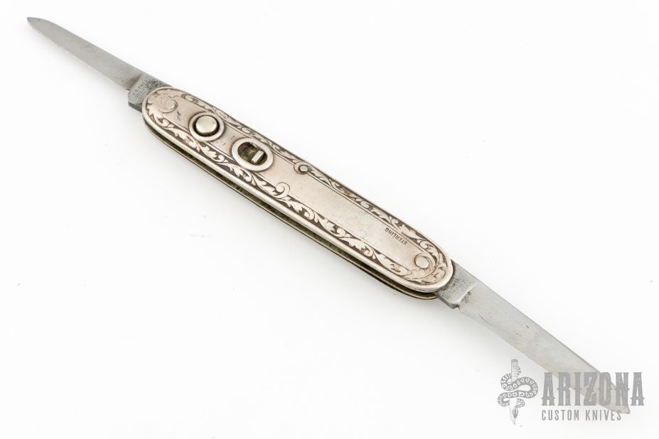 This double auto by Schrade is over 100 years old, it features two satin finished blades both with their own push button and safety. The handle has engraved Sterling silver scales, steel liners and steel backspacer. Has patina and scratches, has been sharpened, has some small dings in the blades, the smaller blade bounces back when fired, both blades don't lock all the way into the handle, has blade peak, fair condition.