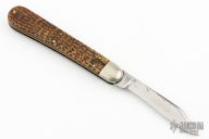 This vintage auto by Press Button Knife Co features a polished clip point blade, nickel silver bolsters, jigged bone scales, steel liners and backspacer. Has patina and scratches, has been sharpened, has a little blade play, otherwise good condition and function for its age.