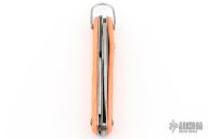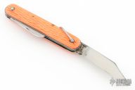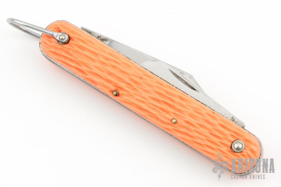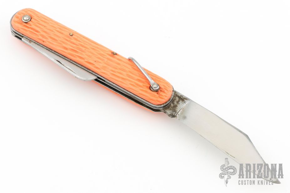 This knife by Schrade features a clip point blade. The handle has orange jigged scales, stainless steel liners and backspacer. Has Safety. Has some blade play, patina and scratches, otherwise the knife is in good condition.