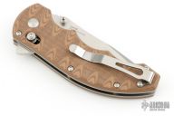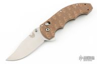 This Axis Lock flipper is a Ball Custom Knives Design executed by Benchmade. The tumble finished clip point blade has a swedge, dual thumb studs, notched thumbrest and flipper. The handle is comprised of sculpted tan and brown G10 scales over skeletonized steel liners and standoffs. AXIS locking mechanism. Comes with original box, papers, and drawstring pouch. Excellent condition.