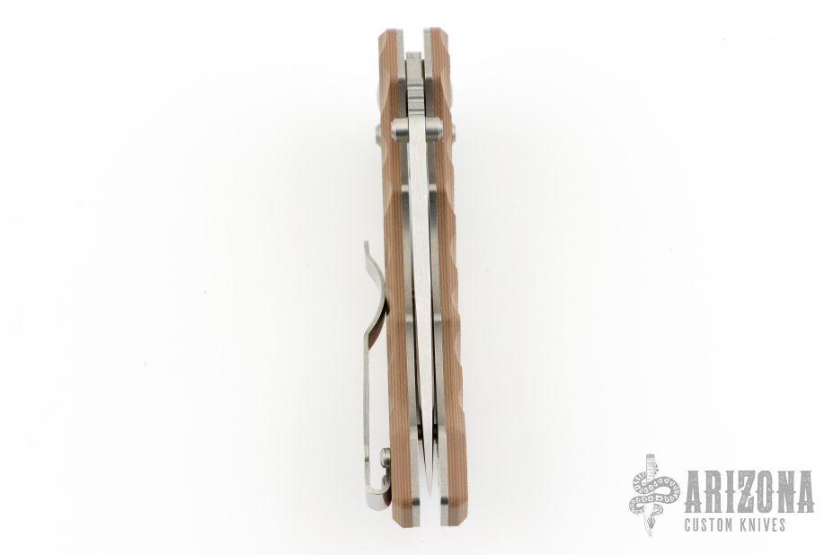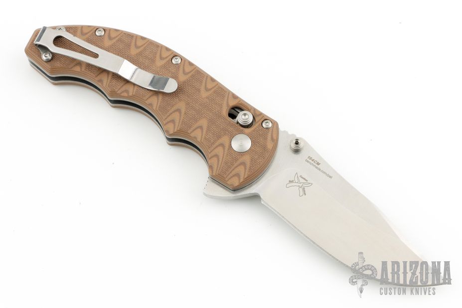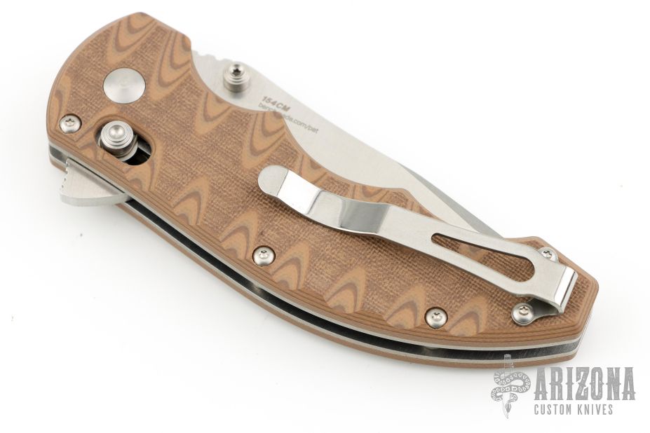 This Axis Lock flipper is a Ball Custom Knives Design executed by Benchmade. The tumble finished clip point blade has a swedge, dual thumb studs, notched thumbrest and flipper. The handle is comprised of sculpted tan and brown G10 scales over skeletonized steel liners and standoffs. AXIS locking mechanism. Comes with original box, papers, and drawstring pouch. Excellent condition.