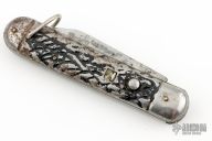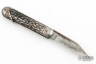 This antique auto by Edgemaster features a clip point satin finished blade. The handle has steel jigged scales, steel liners and backspacer, has safety. Nice action for its age. Has blade very minor play, wear of the black finish on scales, patina and scratches, otherwise fair condition for its age.