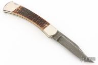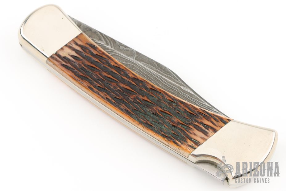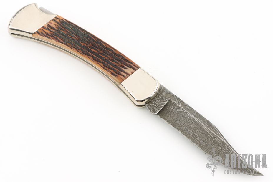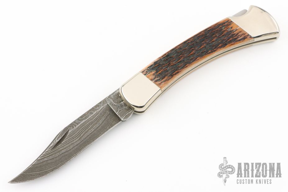 This lock back folder by Buck features a Damascus clip point blade with nail nick. The handle has nickel silver frame and jigged bone inlays. Has some light scuffs and scratches. Great condition otherwise.