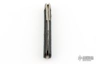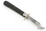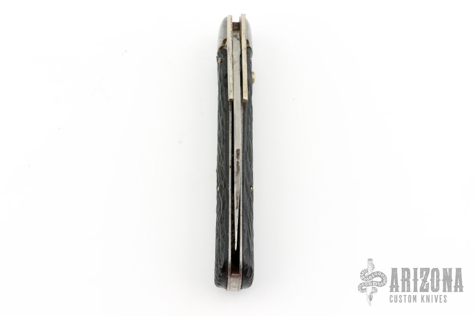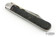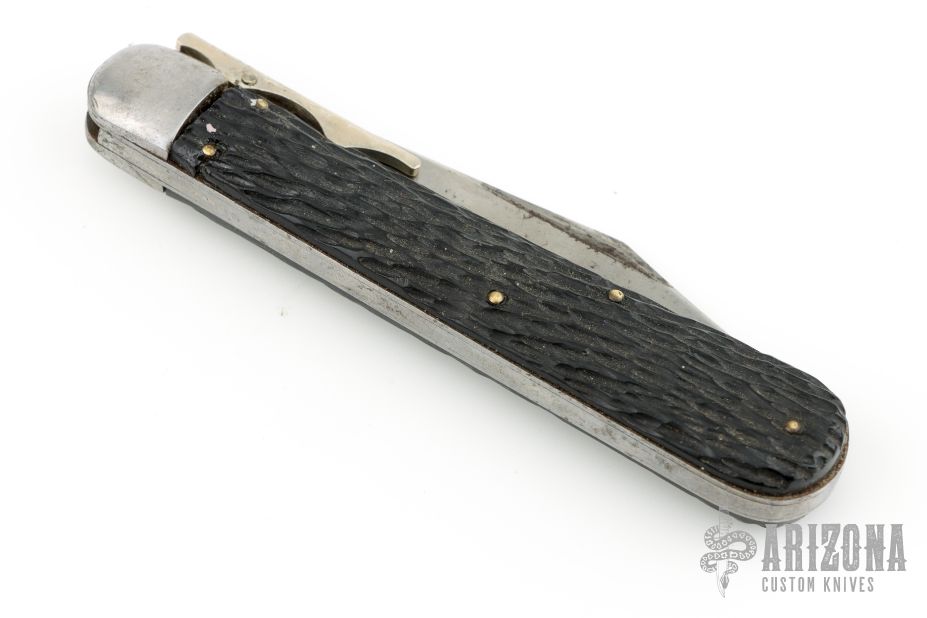 This vintage auto by Schrade Cut. Co. features a satin finished clip point blade. The handle has nickel silver bolsters and swing guard, brass liners, black jigged Bakelite scales, steel backspacer. Has some scratches and patina, otherwise good condition for its age.