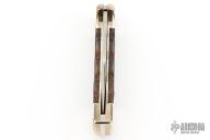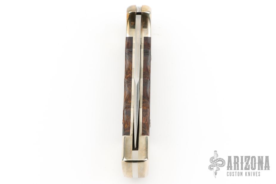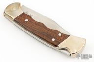 This Buck 112 features a satin finished clip point blade with nail nick. The handle has a nickel silver frame with ironwood scales and a stainless steel backspacer. Comes with original box, papers, and brown leather sheath. Has some light scratches, and patina. Great condition otherwise.