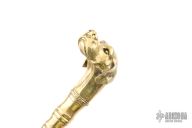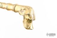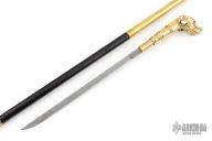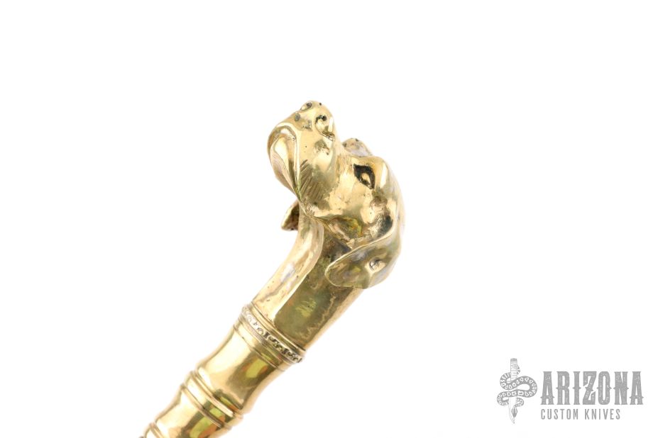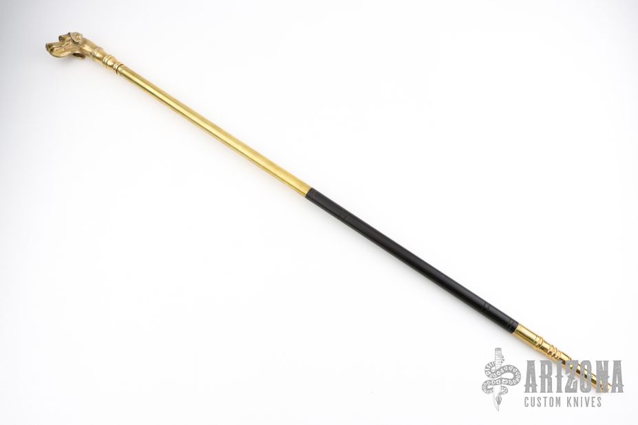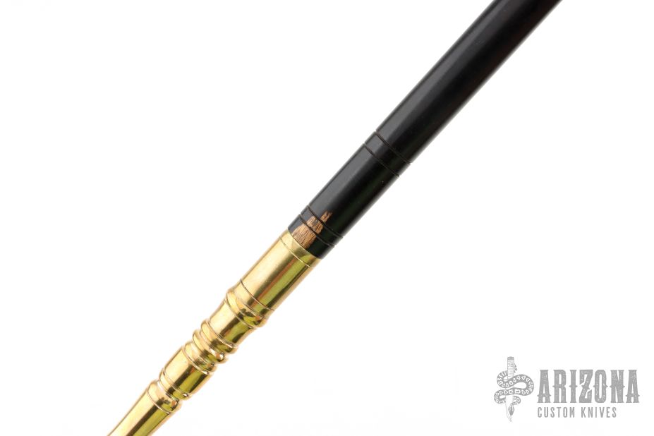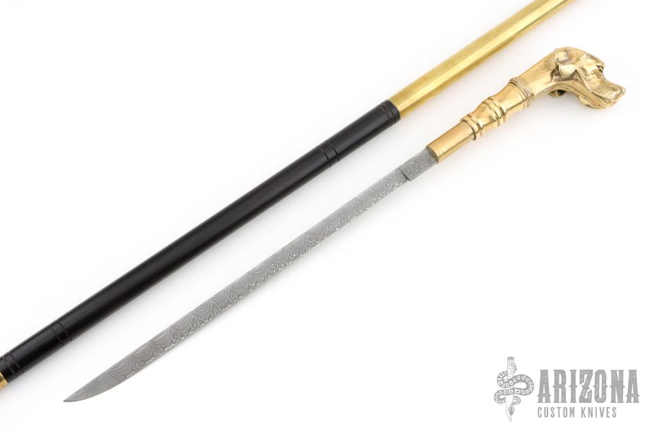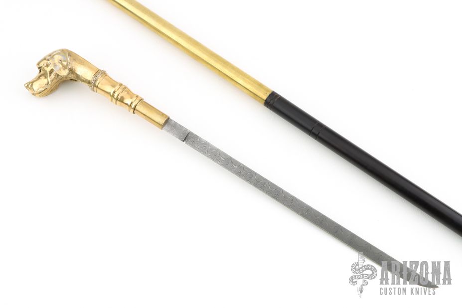 This sword cane by Armenian Doctor Knives features a Zladinox Damascus blade with .151" blade stock and .450" blade depth, hidden tang construction. The handle of the sword and cane is cast and carved bronze. The length of the knife portion of the cane is 10" blade and 15.5" overall, the cane in total is 32" overall. The cane is bronze and ebony wood. New from maker!