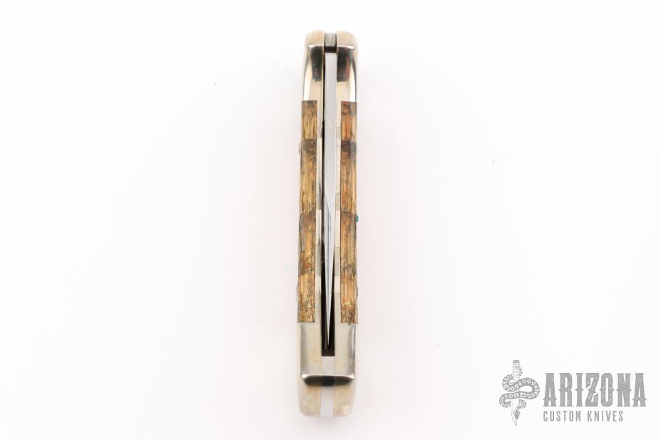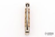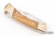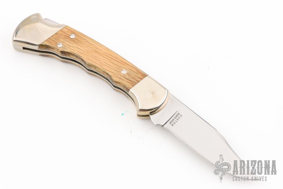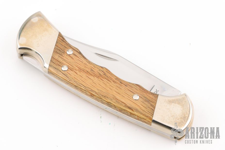 This Buck 112 features a mirror polish finished clip point blade with nail nick. The handle has a nickel silver frame with oak scales and a stainless steel backspacer. Comes with original box, papers, and black leather sheath. Has a couple light scratches, excellent condition otherwise.