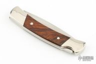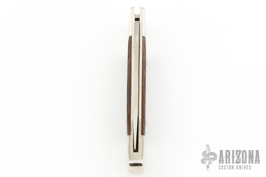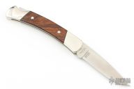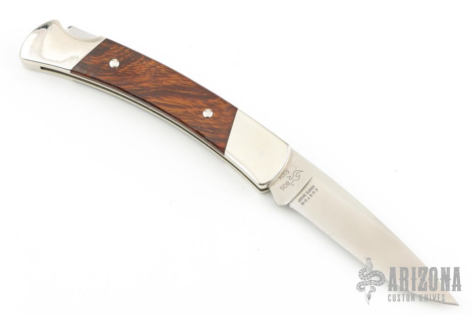 This Buck Custom 501 features a satin finished blade with nail nick. The handle has nickel silver bolsters with integral liners, Palm Wood inlays and a stainless steel spring. Comes with original box and papers. Has a couple light scratches, otherwise Excellent condition.