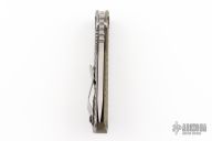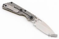 This SNG DGG by M Strider has a stonewashed blade with dual thumb studs, thumbhole, and notched thumbrest. Handle is green G-10 and bead blasted titanium "Gunner Grip", lockbar stabilizer, and titanium tip up clip. Nice detent, lockup and blade seating. New condition.