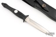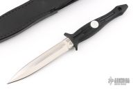 This Shadow I from Al Mar Knives features a doubled edge dagger style satin finish blade. The handle is comprised of zytel over hidden tang construction with lanyard hole in pommel. Includes original box, papers and black leather sheath. Excellent condition.
