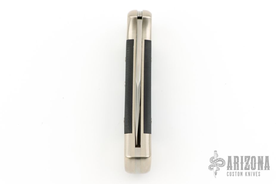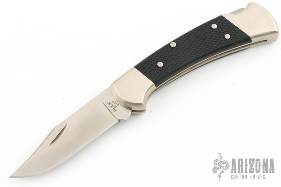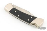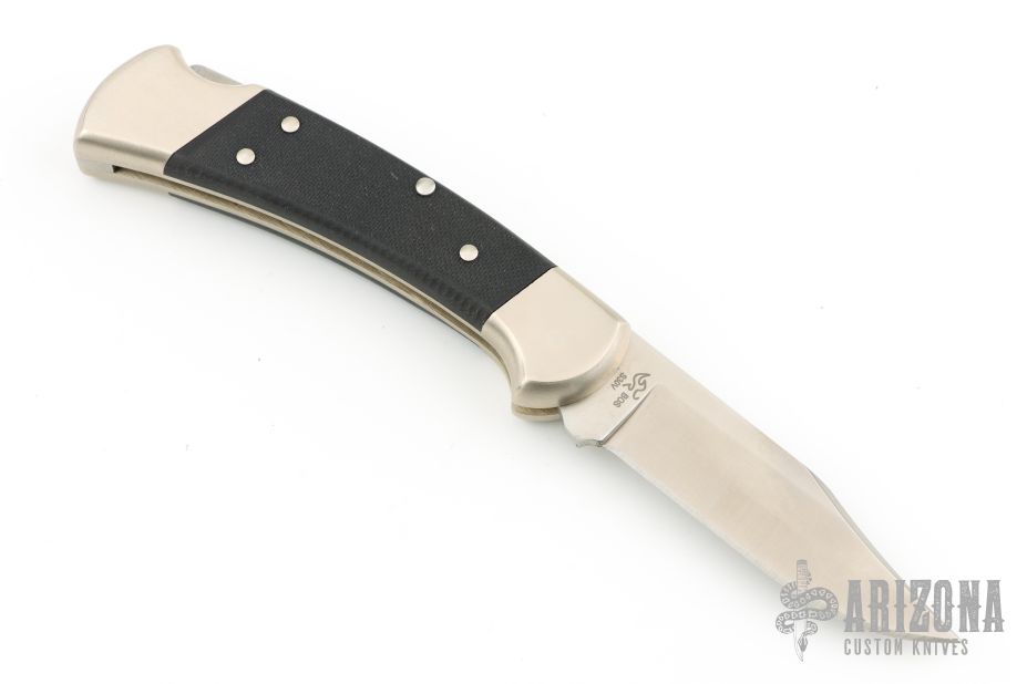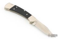This Buck 112 features a satin finished clip point blade with nail nick. The handle has a nickel silver frame with G10 scales and a stainless steel backspacer. Comes with original box, papers, and black leather sheath. Has a couple light scuffs, otherwise Excellent condition.