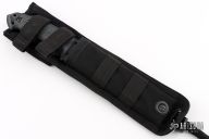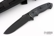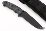 This Hogue fixed blade is an Allen Elishewitz design, it features a black coated drop point blade with swedge and notched thumb rest, .236" blade stock and 1.572" blade depth, full tang construction. The handle is comprised of black/grey G-10 scales over full tang construction with exposed tang glass breaker pommel. Includes nylon sheath and original box. Has som light scuffs, otherwise excellent condition.