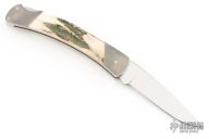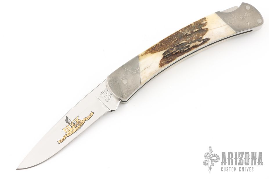 This Buck 501 features a mirror polish finished blade with nail nick. The handle has Damascus bolsters, stainless liners, stag inlays and stainless steel spring. Comes with original box, papers, and leather slip sheath. Has some light scratches, otherwise excellent condition.