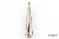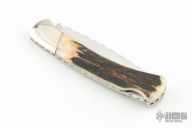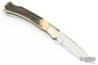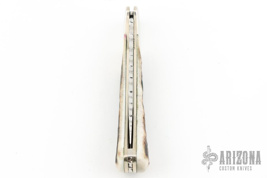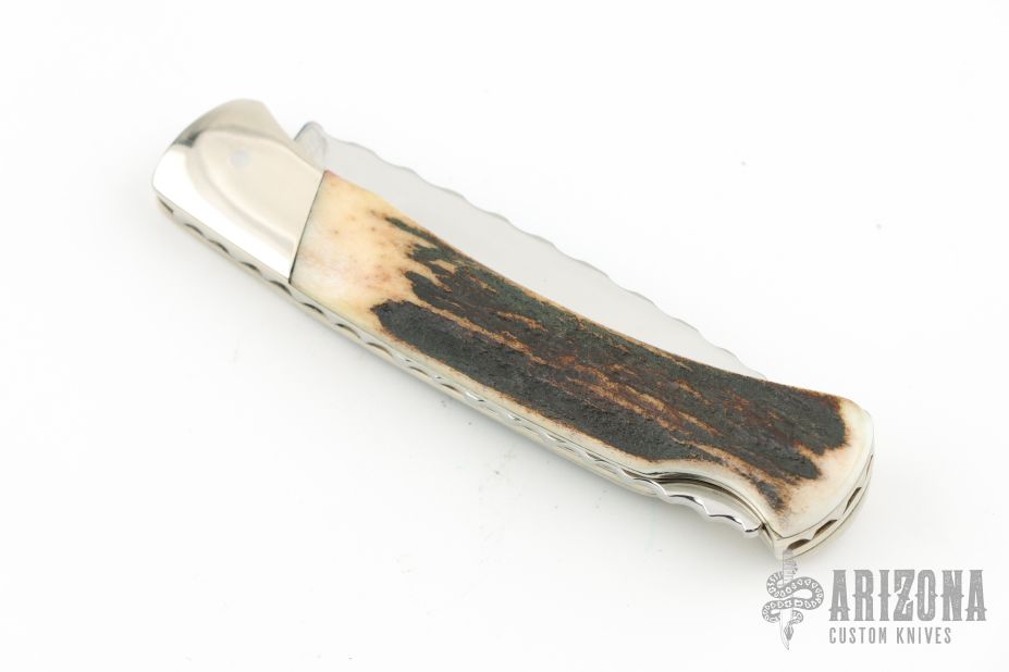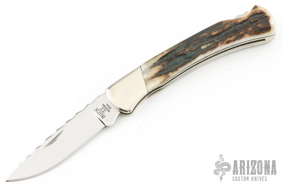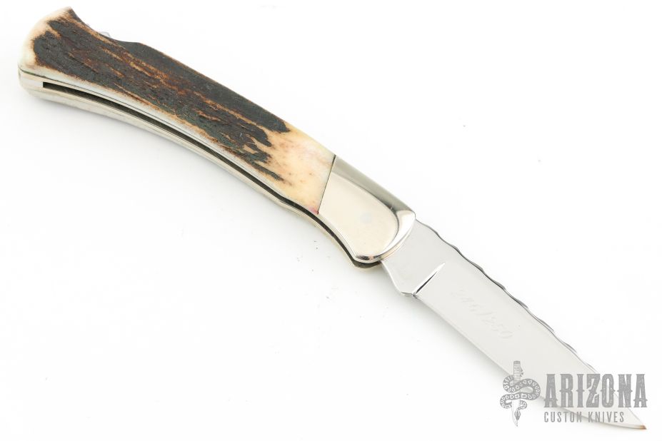 This Buck knife has a mirror polish finished drop point blade with nail nick. File worked blade spine, and spring. Has nickel silver bolsters/frame, stag covers, and stainless spring. Strong lock up, nice blade seating. Comes with original box and papers. #246/250 on the blade. Has some scuffs, scratches, and patina. Great condition otherwise.