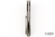 This Vespertilio Flipper by Herman Knives features a stonewashed blade with flipper. The handle has a milled titanium frame with Timascus inlaid bolster, titanium liner, and tip up titanium clip and backspacer. Nice detent, lockup and blade seating. Rides on bearings. Excellent condition. Comes with original zippered case, COA and pivot tool.