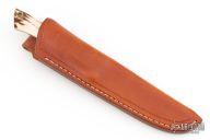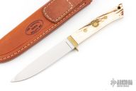 This knife by W.H. Muth features a mirror polished blade with .180" blade stock and .939" blade depth, full tapered tang construction. The handle has a brass guard, stag scales with brass pins and makers mark on the escutcheon. Comes with a brown leather sheath. Excellent condition.