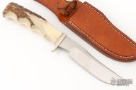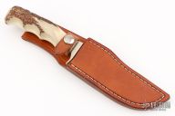 This knife by W.H. Muth features a mirror polished blade with satin finished flats, .180" blade stock and 1.078" blade depth, hidden tang construction. The handle has a nickel silver guard, finger groove stag grip with a nickel silver makers mark on the escutcheon. Comes with a brown leather sheath. Excellent condition.