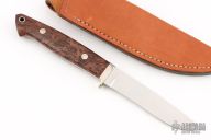 This Loveless Style drop point hunter by WC Davis features a mirror finished drop point blade, .119" blade thickness and .847" blade depth, full tapered tang construction. The handle has a nickel silver guard, burlwood scales with red liners. Comes with a brown leather sheath. Excellent condition.