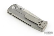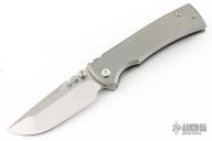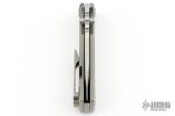 This Chaves Ultramar Redencion Drop Point features a satin finished blade with the Chaves logo, dual thumbstuds, and notched thumbrest. The handle is made up of tumbled titanium, skull pocket clip (positioned for tip up carry), and a matching titanium backspacer. Has overtravel stop. Blade is centered when closed, and locks up with no play. Comes with box and additional clip. New from maker.