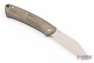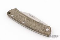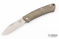 This 318 Proper Slip Joint by Benchmade features a satin finished clip point blade with nail nick and notched thumb rest. The handle is comprised of green micarta covers over steel liners and backspring. Half Stop. Excellent condition.