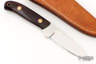 This knife by Joe Cordova features a mirror polished blade with .204" blade stock and .906" blade depth, full tapered tang construction. The handle has maroon linen micarta scales with black and brass liners. Lanyard hole at the butt. Comes with a brown leather sheath. Excellent condition. #247