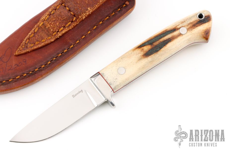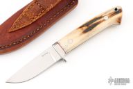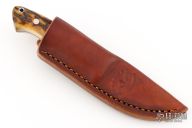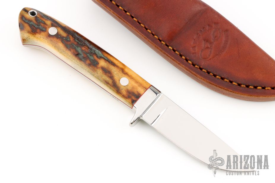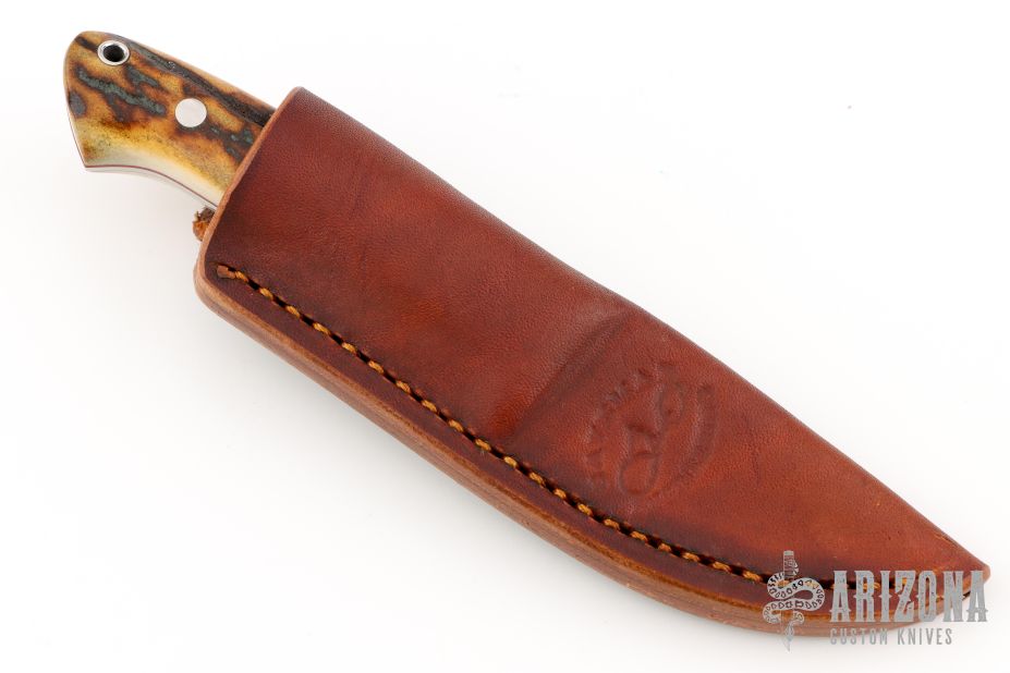 This drop point hunter by GenO Denning features a mirror polished blade with .122" stock and .716" blade depth, full tapered tang construction. The handle has a stainless steel guard, stag scales with red liners/spacers, lanyard hole. Comes with a brown leather sheath. Excellent condition. #0067